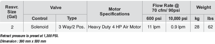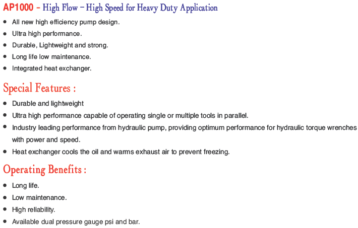 - Bơm cờ lê thủy lực khí nén Powermaster AP1000 sử dụng động cơ khí nén (công suất: 3 kW/4 HP), áp khí nén đầu vào: 4 - 8 bar, 2 cấp tốc độ, với lưu lượng đẩy dầu: 11 - 0.9 lít tại lần lượt 600 psi (40 bar) - 10.000 psi (700 bar).