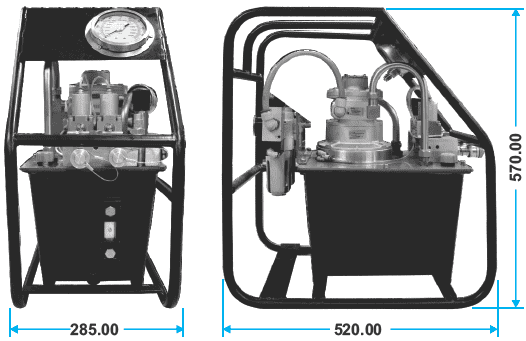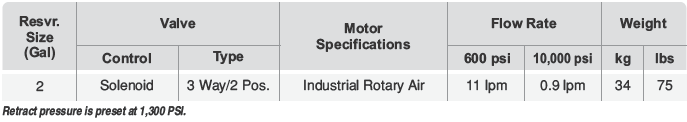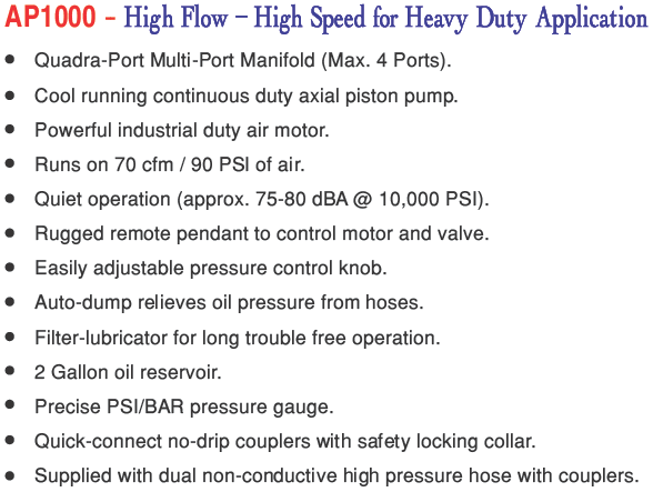 - Bơm cờ lê thủy lực khí nén Powermaster AP1000S sử dụng động cơ khí nén (công suất: 3 kW/4 HP), áp khí nén đầu vào: 4 - 8 bar, độ ồn max: 75 - 80 dB(A), 2 cấp tốc độ, với lưu lượng đẩy dầu: 11 - 0.9 lít tại lần lượt 600 psi (40 bar) - 10.000 psi (700 bar).
