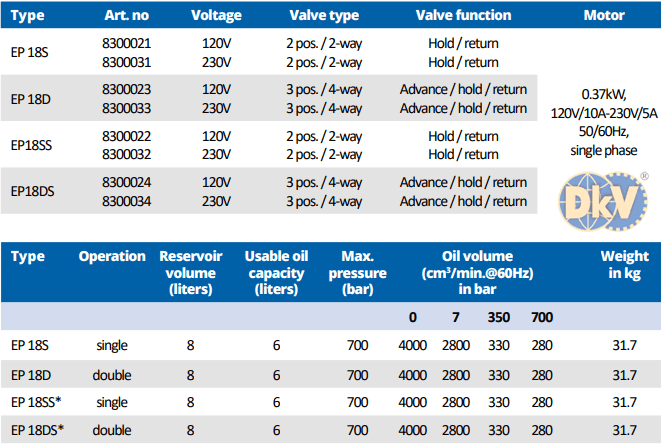 - Bơm điện thủy lực Betex EP 18DS, Betex electric hydraulic pump EP 18DS: là loại bơm điện thủy lực 1 phase, valve điện từ, dung tích dầu: 8 lít, dung tích dầu hữu dụng: 6 lít,. áp hoạt động < 700 bar (70 MPa), chuyên dùng cho kích thủy lực, tools thủy lực 2 chiều trong nâng hạ công nghiệp. Bơm điện thủy lực Betex EP 18DS có lưu lượng đẩy dầu đạt 280 cm3/phút (tại 700 bar).