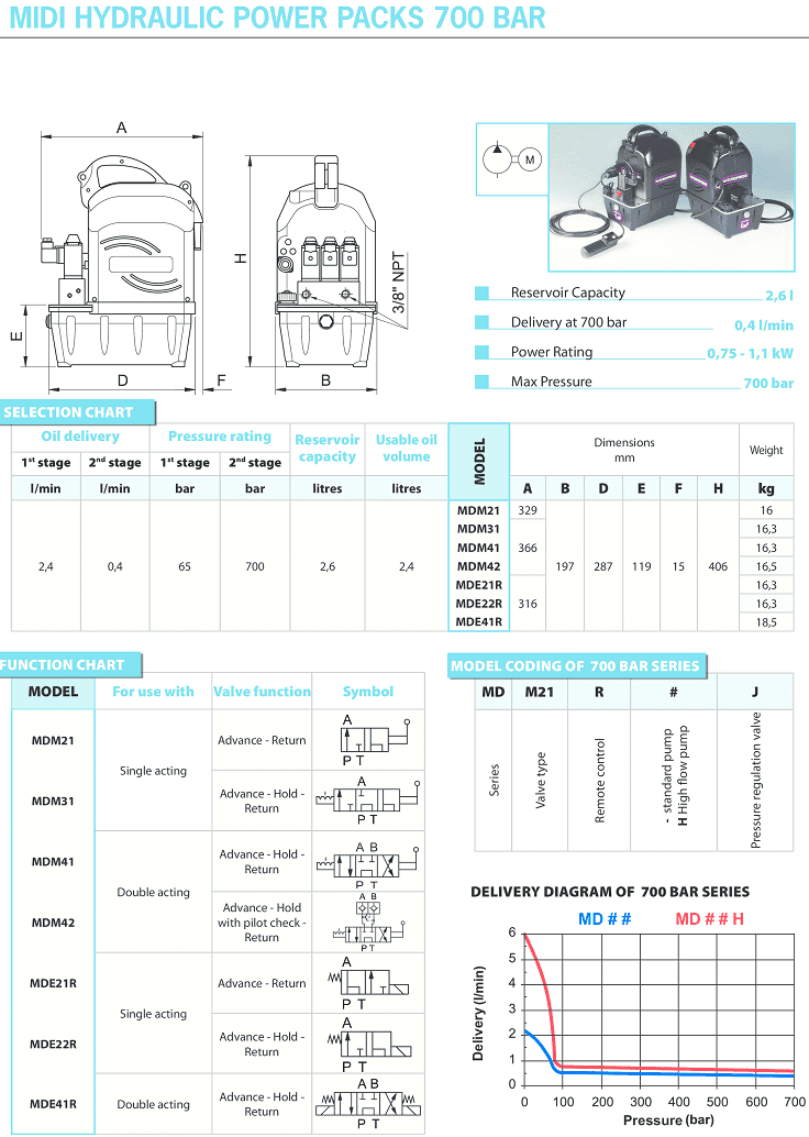 - Bơm điện thủy lực Europress MDM41 sử dụng động cơ: 0.75 - 1.1 kW/230V/50Hz/1ph.