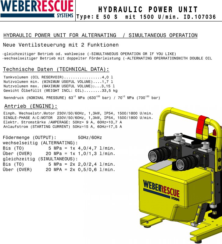 - Bơm điện thủy lực Weber E 50 S thuộc dạng 2 cấp tốc độ, sử dụng động cơ: 1.3 kW/230V/50Hz/1ph, Lưu lượng đẩy dầu: 4.7/1.3 lít/phút tại 50/250 bar (5/25 MPa). Trang bị 2 ống dây (chiều dài mỗi ống lên đến 15 m) phù hợp cho mọi môi trường làm việc trên cao hoặc dưới nước.