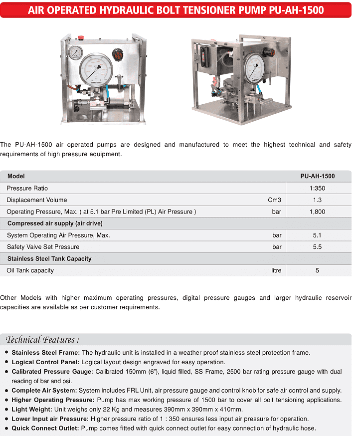 - Bơm khí nén thủy lực Powermaster PU-AH-1500, Powermaster Air high pressure hydraulic pumps PU-AH-1500 có dung tích thùng dầu: 5 lít, áp hoạt động < 1.500 bar (21.750 psi). Bơm căng bulong thủy lực Powermaster PU-AH-1500 chuyên dùng cho căng bulong thủy lực (hoặc tools thủy lực) đơn chiếc hoặc hệ thống căng bulong thủy lực hoạt động cùng lúc thông qua bộ chia.