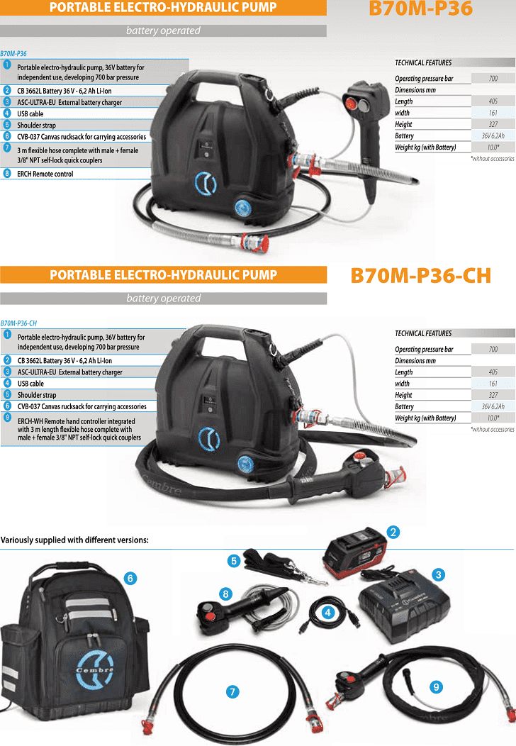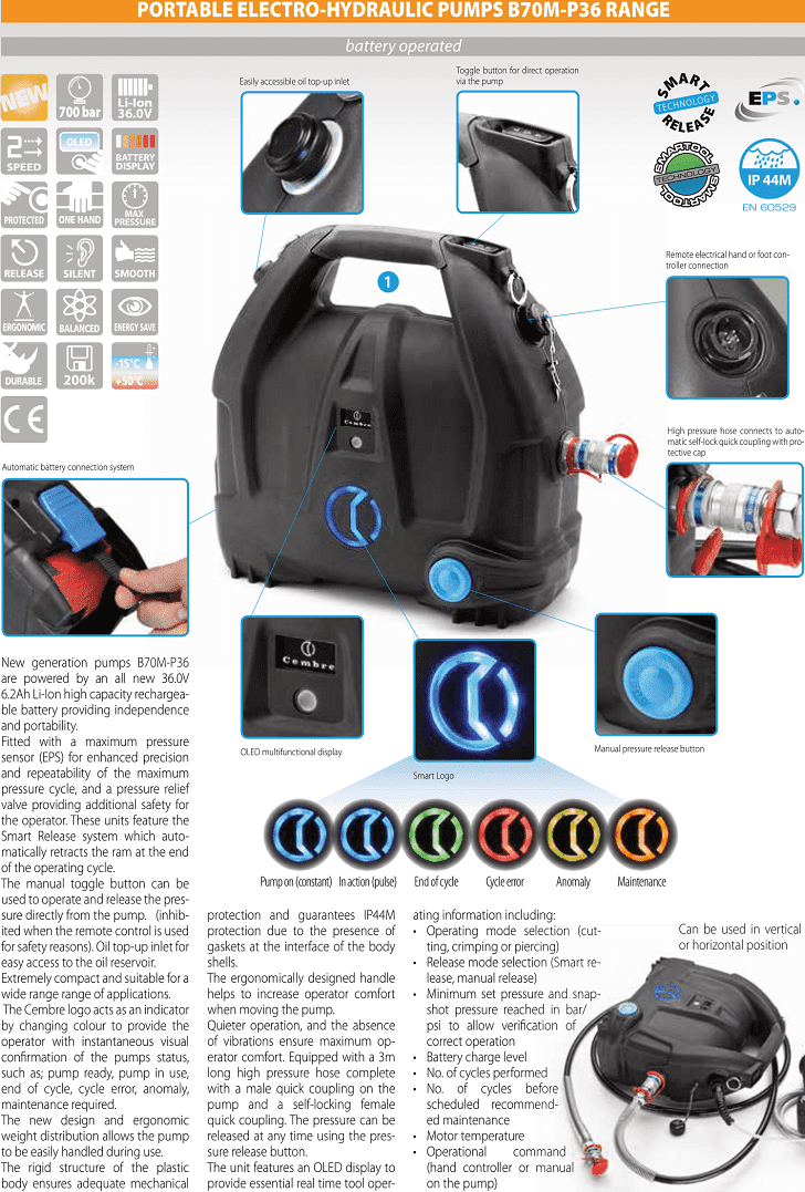 - Bơm tay thủy lực Cembre B70M-P36T với động cơ: Li-Ion 36.0V 6.2Ah thuộc dạng bơm pin 2 cấp tốc độ, thuộc loại bơm pin thủy lực hoạt động 1 chiều, áp hoạt động tối đa: < 700 bar (70 MPa), cho phép đấu nối nhanh với kích và tools thủy lực thông qua ống dây thủy lực, phụ kiện.