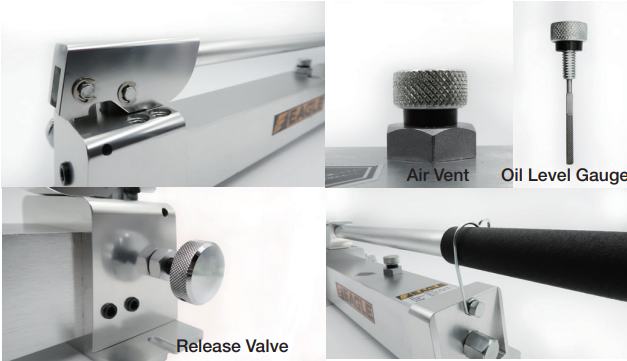- Valve điều khiển (đóng/mở) phía đầu kích dạng núm vặn vận hành đơn giản. Núm đổ dầu (bổ sung dầu), xả hơi thừa phía cuối bơm cho thao tác nhanh chóng.