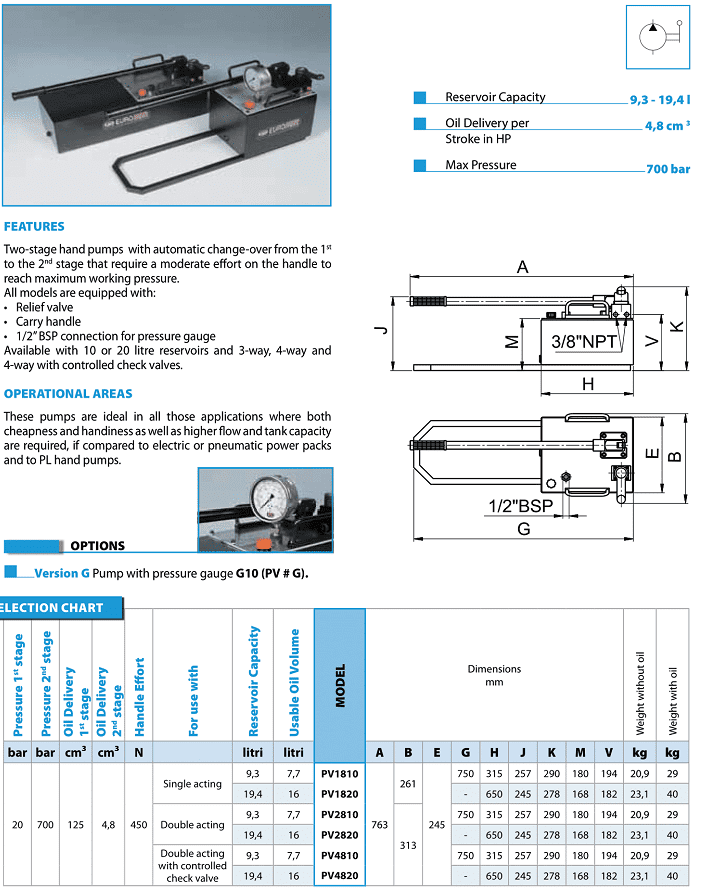 - Bơm tay thủy lực Europress PV1810 thuộc dạng bơm tay 2 cấp tốc độ, thuộc loại bơm tay thủy lực hoạt động 1 chiều có dung tích chứa dầu: 9.3 lít, dung tích dầu hữu dụng: 7.7 lít, áp hoạt động tối đa: < 700 bar (70 MPa), cho phép đấu nối nhanh với kích và tools thủy lực thông qua ống dây thủy lực, phụ kiện.