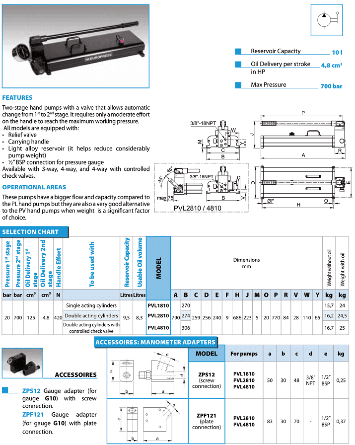 - Bơm tay thủy lực Europress PVL2810 thuộc dạng bơm tay 2 cấp tốc độ, thuộc loại bơm tay thủy lực hoạt động 2 chiều có dung tích chứa dầu: 9.5 lít, dung tích dầu hữu dụng: 8.3 lít, áp hoạt động tối đa: < 700 bar (70 MPa), cho phép đấu nối nhanh với kích và tools thủy lực thông qua ống dây thủy lực, phụ kiện.