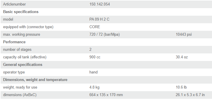 - Có thể được lắp ráp hoàn chỉnh với ống dây dài 3 m, khớp nối. Bơm tay thủy lực Holmatro PA 18 F 2 C không trang bị đồng hồ đi kèm bơm.
