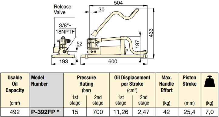 - Bơm chân thủy lực Enerpac P392FP, Enerpac hydraulic foot pump P392FP: là loại bơm thủy lực cỡ nhỏ, đạp chân, dung tích sử dụng dầu hữu ích: 0.492 lít, áp hoạt động < 700 bar (70 MPa), thuộc dạng 2 cấp tốc độ, chuyên dùng cho kích thủy lực, tools thủy lực 1 chiều trong công nghiệp.