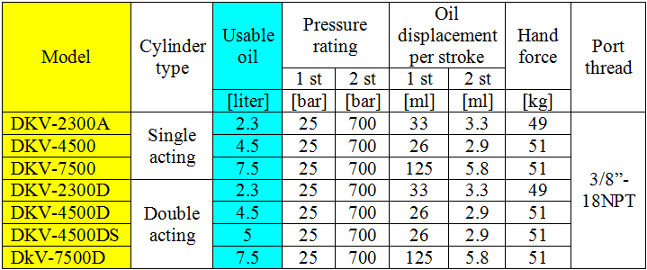 - Bơm thủy lực DKV-4500D, bơm tay thủy lực DKV-4500D, hydraulic pump DKV-4500D: là loại bơm tay thủy lực 2 chiều, thân vỏ thép, có dung tích chứa dầu 4.5 lít, áp hoạt động < 700 bar (70 MPa), chuyên dùng cho kích thủy lực 2 chiều và tools thủy lực 2 chiều trong công nghiệp.