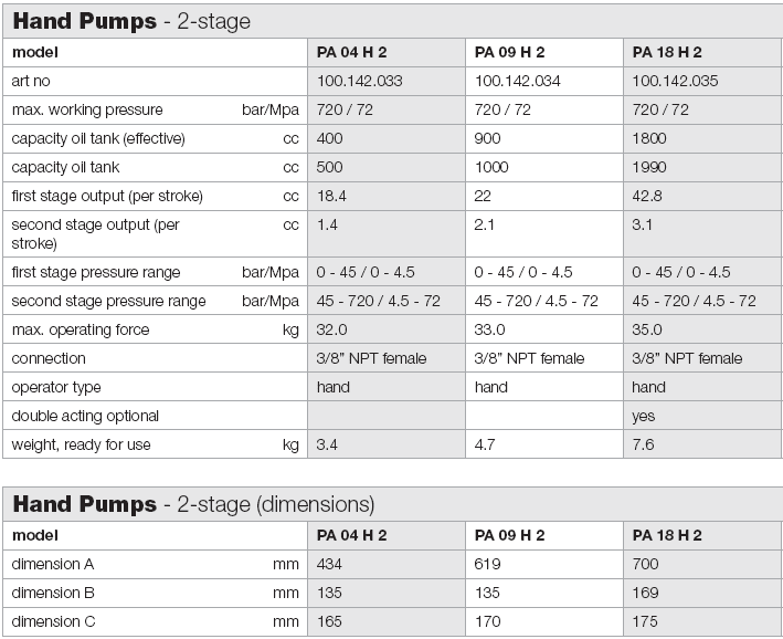 - Bơm thủy lực Holmatro PA 04 H 2 thuộc loại 2 cấp tốc độ, với lưu lượng đẩy dầu: 18.4 cc/hành trình đẩy tay (0 - 45 bar) - 1.4 cc/hành trình đẩy tay (45 - 720 bar). Lực đẩy tay max: 32 kg ~ 320 N.