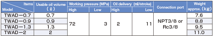 - Bơm thủy lực Osaka TWAD-0.7, bơm tay thủy lực Osaka TWAD-0.7, Osaka hydraulic pump TWAD-0.7 là loại bơm tay thủy lực 2 chiều, thân vỏ thép, có dung tích chứa dầu 0.7 lít, áp hoạt động < 720 bar (72 MPa), chuyên dùng cho kích và tools thủy lực.