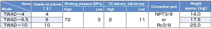 - Bơm thủy lực Osaka TWAD-10, Osaka hydraulic pump TWAD-10 là loại bơm tay thủy lực 2 chiều, thân vỏ thép, có dung tích chứa dầu 10 lít, áp hoạt động < 720 bar (72 MPa), chuyên dùng cho kích và tools thủy lực 2 chiều.