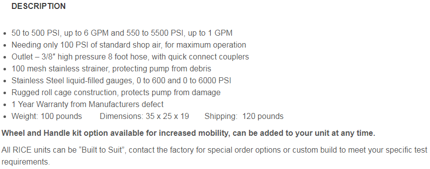 - Bơm test áp lực nước khí nén Rice HPD-6/35 chuyên dùng để thử áp kiểm tra áp lực (nước, dầu nhờn, hóa chất..), tình trạng dò gỉ trên các đường ống, mối nối, valve. Bơm thử áp lực khí nén Rice HPD-6/35 có dải áp đo test: 3.45 - 241 bar (500 - 3.500 psi).