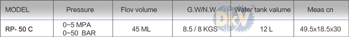 - Bơm test áp lực nước RP-50 C là sản phẩm OEM (đặt hàng gia công chế tạo) tại Trung Quốc của DKV VIET NAM CO.,LTD. Made in China.
