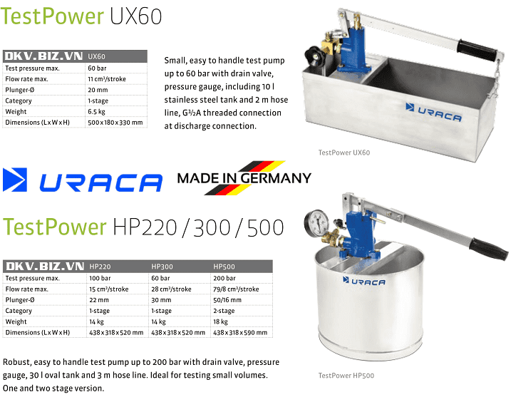 - Bơm test áp lực Uraca UX60 được sản xuất bởi Uraca GmbH & Co.KG - Bad Urach - Đức. Made in Germany. DKV VIET NAM nhập khẩu, phân phối và service tại Việt nam.