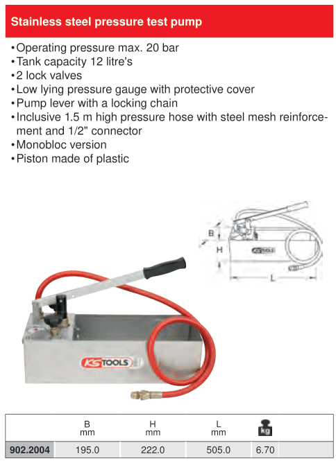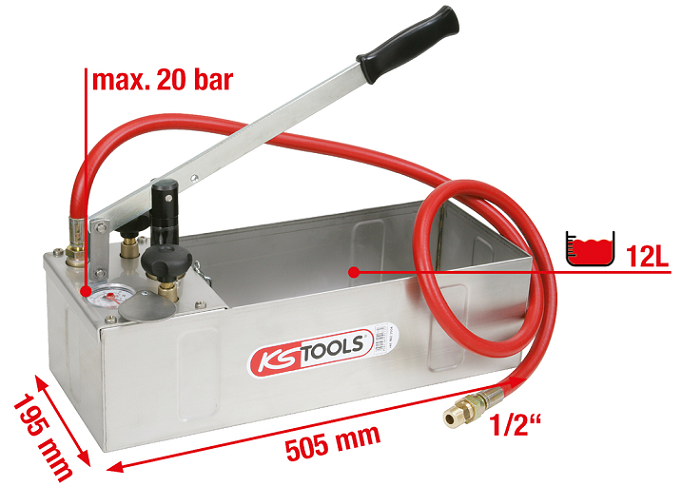 - Bơm thử áp lực nước KS Tools 902.2004, KS Tools hydrostatic test pump 902.2004 chuyên dùng để thử áp kiểm tra áp lực nước, tình trạng dò gỉ trên các đường ống, mối nối, valve. Bơm thử áp lực nước KS Tools 902.2004 có dải áp đo test: 0 - 20 bar, dung tích thùng chứa: 12 lít.