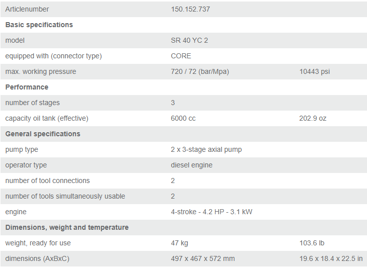 - Bơm xăng thủy lực Holmatro SR 40 PC 2 S có kích thước bao: 497 x 467 x 492 mm, trọng lượng: 41.9 kg, được chế tạo và sản xuất bởi Holmatro Rescue Equipment B.V. Made in Netherlands.
