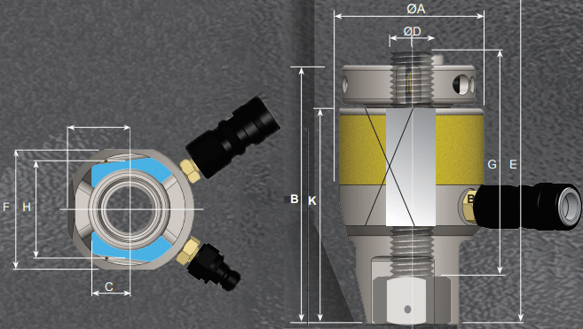 - Mỗi căng bulong thủy lực dưới nước TorcUP C8-01(M24) trang bị 2 coupler nối nhanh kiểu cắm rút 1/4'-BSP, cho phép mắc nối tiếp khi siết nhiều đầu căng bulong thủy lực cùng lúc, hoặc kết nối nhanh với bơm tay, bơm khí nén căng bulong thủy lực khi siết đơn chiếc.