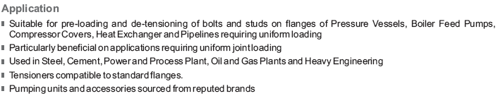 - Ứng dụng chủ yếu của căng bulong thủy lực Orione OBT 15-265-80: siết bulong móng cường độ cao, siết mặt bích với yêu cầu độ đồng tâm, đồng phẳng, kín khít cao trong nghành đường ống.