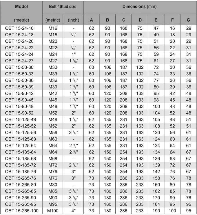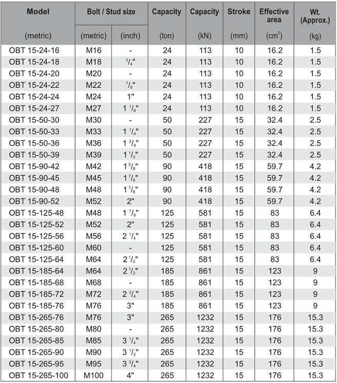- Căng bulong thủy lực Orione OBT 15-265-80, Orione hydraulic bolt tensioner OBT 15-265-80: chuyên dùng để siết bulong cường độ cao trong công nghiệp M80, với lực siết max: 1.232 kN, hành trình max: 15 mm, áp hoạt động 1.500 bar (150 MPa).