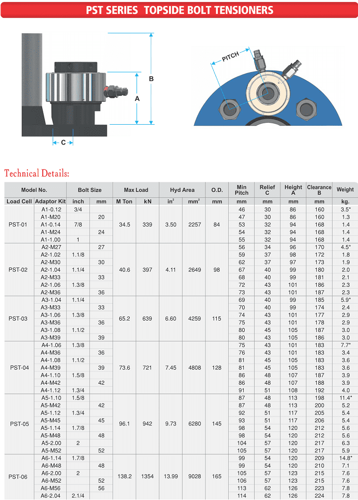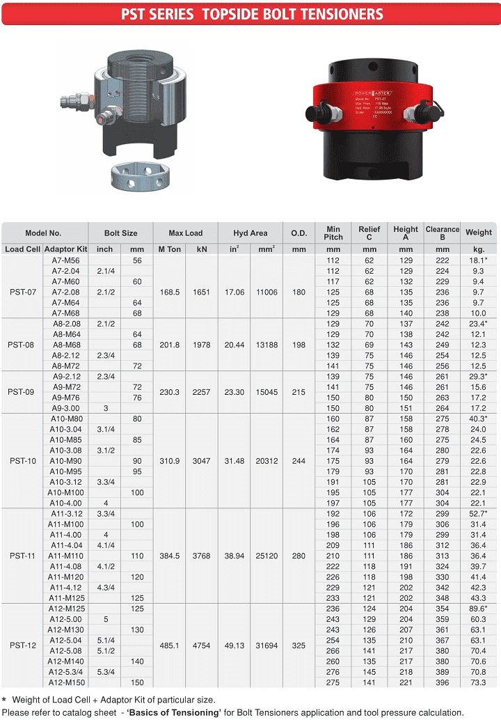 - Căng bulong thủy lực Powermaster PST-05, Powermaster hydraulic bolt tensioner PST-05: chuyên dùng để siết bulong cường độ cao 1.5/8" trong công nghiệp, với lực siết max: 942 kN, hành trình max: 15 mm, áp hoạt động max 1.500 bar (150 MPa).