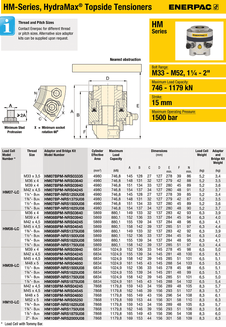 - Bộ đầu kết nối và quang đai căng bulong thủy lực Enerpac HM09BPM-NRS04850, Enerpac adaptor and bridge kit HM09BPM-NRS04850: là 2 bộ phận cấu thành lên đầu căng bulong thủy lực, khi đầu nối với xylanh thủy lực căng bulong thủy lực Enerpac HM09-LC (1.024,9 kN), chuyên kéo/rút siết bulong cường độ cao M48x5 trong công nghiệp.