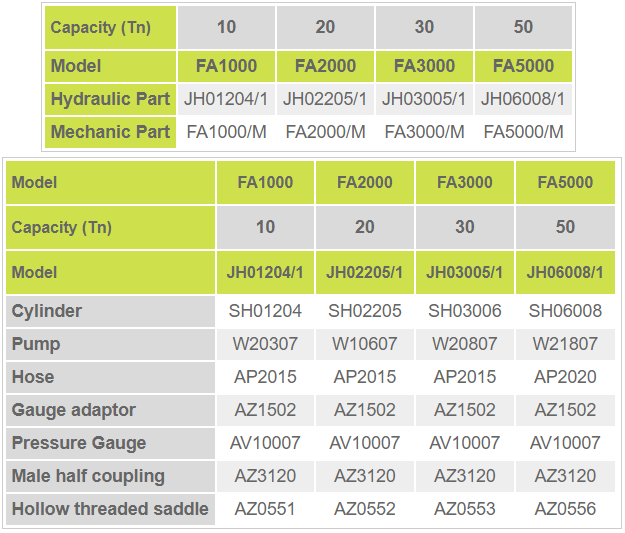 - Bộ cảo thủy lực Larzep FA3000 cung cấp với một bộ thủy lực đầy đủ bao gồm kích thủy lực (SH03006), bơm tay thủy lực (W20807), ống dây đi kèm (AP2015), đồng hồ đi kèm (AZ1502) và các phụ kiện khác.
