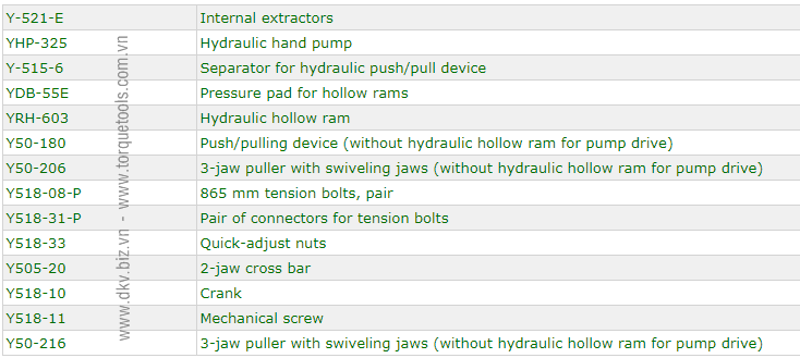 Toàn bộ dùng chung chiếc bơm tay thủy lực Kukko YHP-325 (0.9 lít, 700 bar), đấu nối với nhau thông qua ống dây tích hợp coupler, có lắp áp kế.