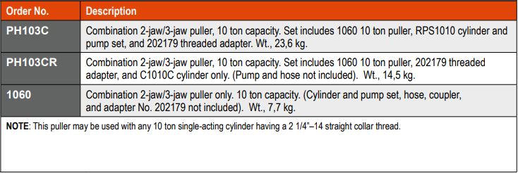 - Cảo thủy lực Power Team PH103CR, Power Team hydraulic puller PH103CR: của hãng SPX/Power Team có sức móc max: 10 tấn, với độ mở max: 432 mm, hành trình: 381 mm. Cảo thuỷ lực Power Team PH103CR là loại cảo thủy lực liền bơm (tích hợp sẵn bơm trên thân xilanh).