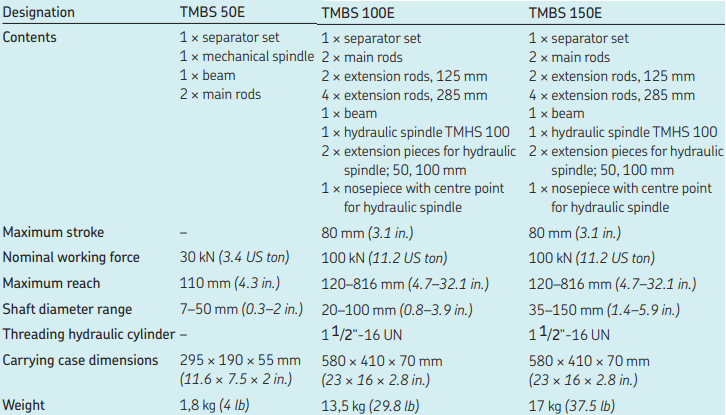 - Các chi tiết chính của bộ cảo thủy lực SKF TMBS 150E: xylanh thủy lực SKF TMHS 100 (11.2 tấn, 80 mm, ren chính: 1-1/2"- 16UN), 2 khúc chống tâm (50 mm và 100 mm), cùng 1 đầu định tâm, vai cảo 2 chấu dạng thẳng, 1 cặp trục chân cảo bulong ngắn 125 mm, 2 căp trục chân cảo bulong dài: 285 mm, 1 cặp chân kết nối, bắt vào vam cảo đĩa: 35 - 150 mm, được đặt toàn bộ trong vali nhựa công nghiệp.