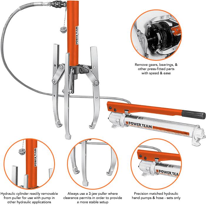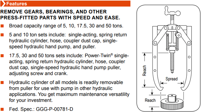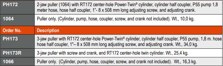 - Cảo thủy lực Power Team PH173R, Power Team hydraulic puller PH173R: của hãng SPX/Power Team có sức móc max: 17.5 tấn, với độ mở max: 508 mm, hành trình: 292 mm. Cảo thuỷ lực Power Team PH173R là loại cảo thủy lực liền bơm (tích hợp sẵn bơm trên thân xilanh).