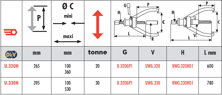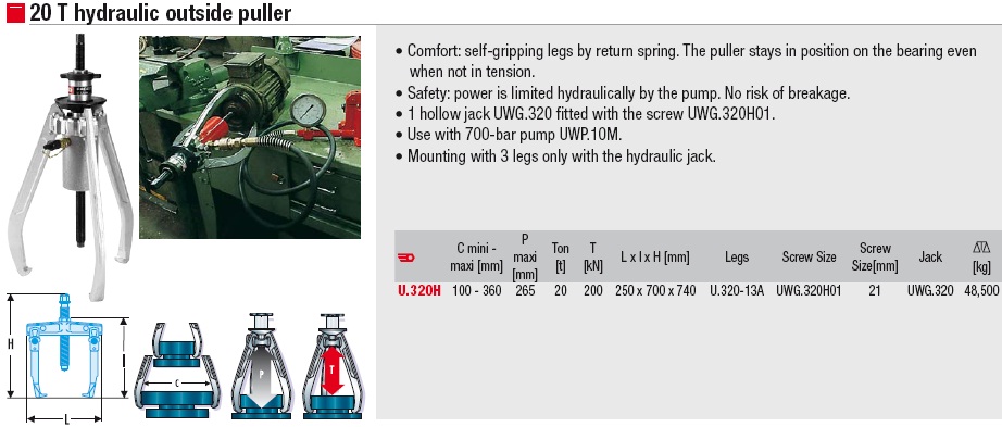 - Cảo thủy lực Facom U.320H, Facom hydraulic puller U.320H: là loại cảo thủy lực dời bơm, tự định tâm, với sức móc đẩy max: 20 tấn, độ mở (spread): 100 - 360 mm, chiều sâu họng, tầm với max (reach): 265 mm, chuyên dùng để tháo/lắp vòng bi, bạc đạn, puly, bánh đà trong công nghiệp.