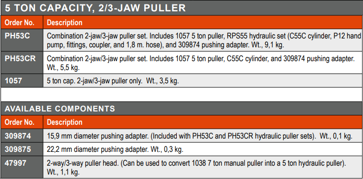 - Cảo thủy lực Power Team PH53CR, Power Team hydraulic puller PH53CR: của hãng SPX/Power Team có sức móc max: 5 tấn, với độ mở max: 292 mm, hành trình: 222 mm. Cảo thuỷ lực Power Team PH53CR là loại cảo thủy lực liền bơm (tích hợp sẵn bơm trên thân xilanh).