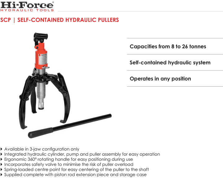 - Cảo thủy lực Hi-Force SCP103, Hi-Force hydraulic puller SCP103: là loại cảo thủy lực liền bơm, cỡ nhỏ, với sức móc đẩy max: 8 tấn, với độ dải mở: 30 - 310 mm, chiều sâu họng (tầm với): 195 mm, hành trình xilanh 82 mm, trục nối dài xylanh: 50 mm. Cảo thủy lực Hi-Force SCP103 thuộc dạng cảo liền bơm, chuyên dùng để tháo lắp: vòng bi, bạc đạn, puli, bánh đà..trong công nghiệp.