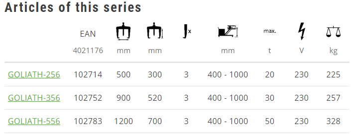 Xe cảo thủy lực Kukko GOLIATH-256, Kukko mobile hydraulic puller GOLIATH-256 có sức móc max: 20 tấn, độ mở max: 500 mm, chiều dài chân cảo: 300 mm. Xe cảo thủy lực Kukko GOLIATH-256 có trang bị bơm điện thủy lực (230 V/1ph) và bơm tay thủy lực, đặt trên một xe đẩy có chiều cao nâng tại điểm gá cảo: 400 - 1.000 mm.
