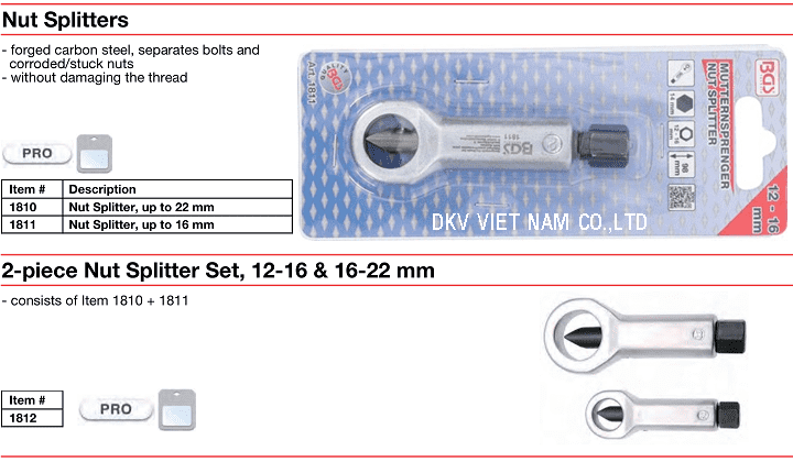 - Cắt đai ốc cơ khí BGS 1811, BGS nut splitter 1811: sử dụng để cắt các loại bulong, đai ốc có size max: 16 mm, cấp bền: 5, 7 và 8. Đây là loại đầu cắt đai ốc thuần cơ khí, do BGS/Germany sản xuất, khi sử dụng cờ lê hoặc tay công làm lực siết cắt.