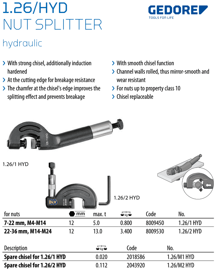 - Cắt đai ốc cơ khí Gedore 1.26/2 HYD, Gedore nut splitter 1.26/2 HYD: sử dụng để cắt các loại bulong, đai ốc có size 22 (M14) - 36 mm (M24), cấp bền: 5, 7, 8 và 10, lực cắt max: 13 tấn. Đây là loại đầu cắt đai ốc thuần cơ khí, do Gedore/Germany sản xuất, khi sử dụng cờ lê hoặc tay công làm lực siết cắt.