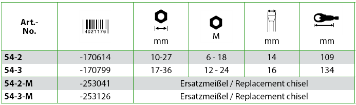 - Cắt đai ốc Kukko 54-2, Kukko nut splitter 54-2: sử dụng để cắt các loại bulong, đai ốc có size 10 (M6) - 27 mm (M18), cấp bền: 5, 6 và 8. Đây là loại đầu cắt đai ốc thuần cơ khí, do Kukko/Germany sản xuất, khi sử dụng cờ lê hoặc tay công làm lực siết cắt.