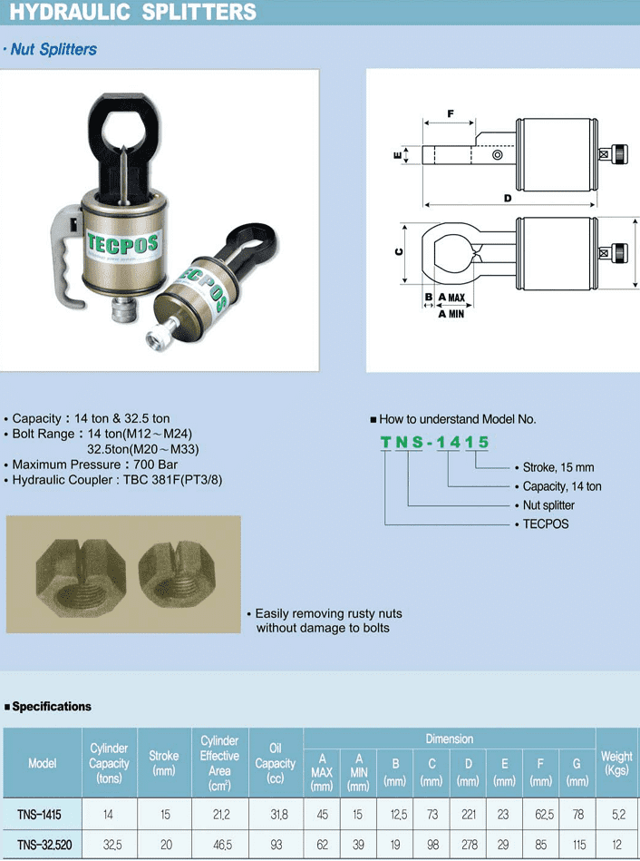 - Cắt đai ốc thủy lực lực Tecpos TNS-32.520, Tecpos hydraulic nut splitter TNS-32.520 là loại đầu cắt đai ốc chất lượng cao của Tecpos/Korea, với dải cắt đai ốc: 39 mm - 62 mm, lực đẩy cắt max: 32.5 tấn, hành trình xylanh lưỡi cắt: 20 mm, chuyên dùng để cắt đứt các loại bulong cường độ cao trong công nghiệp.