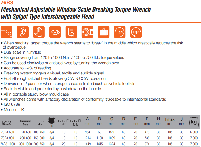 - Cờ lê lực Bahco 76R3-1000 , cờ lê siết lực Bahco 76R3-1000 , Bahco torque wrench 76R3-1000 chuyên dùng để siết lực (moment) chính xác các loại bulong, đai ốc, vít trong công nghiệp. Cờ lê siết lực Bahco 76R3-100 có dải lực siết: 300 - 1.000 N.m (200 - 750 ft.lb), bước tiến: 20 N.m/vạch (10 ft.lb/vạch), size nhét đầu khẩu: 3/4".