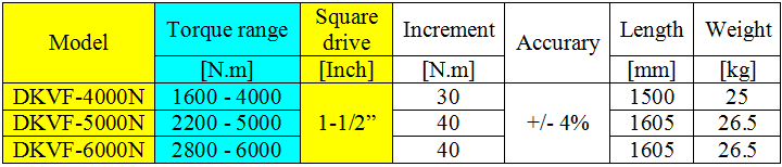 - Cờ lê lực DKVF-5000N, cờ lê siết lực DKVF-5000N, Torque wrench DKVF-5000N: thuộc loại cờ lê lực đầu liền, dùng khẩu để siết, với size nhét đầu khẩu: 1-1/2", dải lực siết: 2200 - 5000 N.m, bước tiến: 40 N.m/vạch, sai số theo nhà sản xuất nêu: +/- 4%, chế tạo theo tiêu chuẩn DIN EN ISO 6789:2003 Type II Class A.