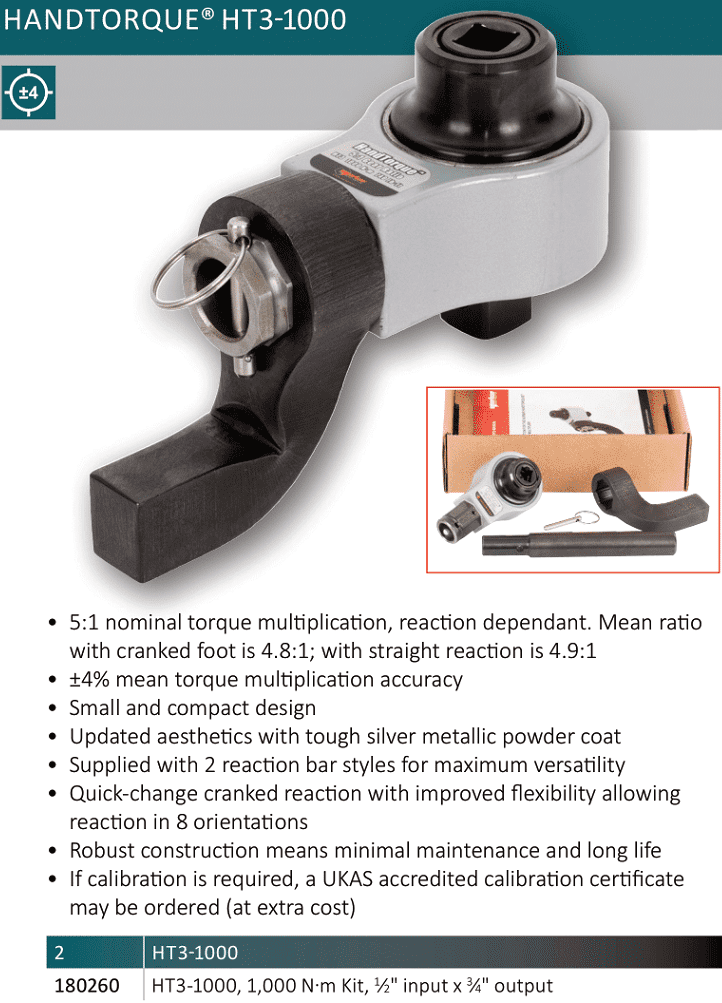 - Cờ lê nhân lực Norbar HT3-1000, Norbar torque multiplier HT3-1000: là dụng cụ chuyên dụng để siết lực (moment) chính xác các loại bulong cường độ cao trong công nghiệp, với lực siết max: 1.000 N.m, hệ số nhân: 4.8:1 (khi gá ngang) và 4.9:1 (khi gá thẳng), cỡ khẩu vào: 1/2", cỡ khẩu ra: 3/4".