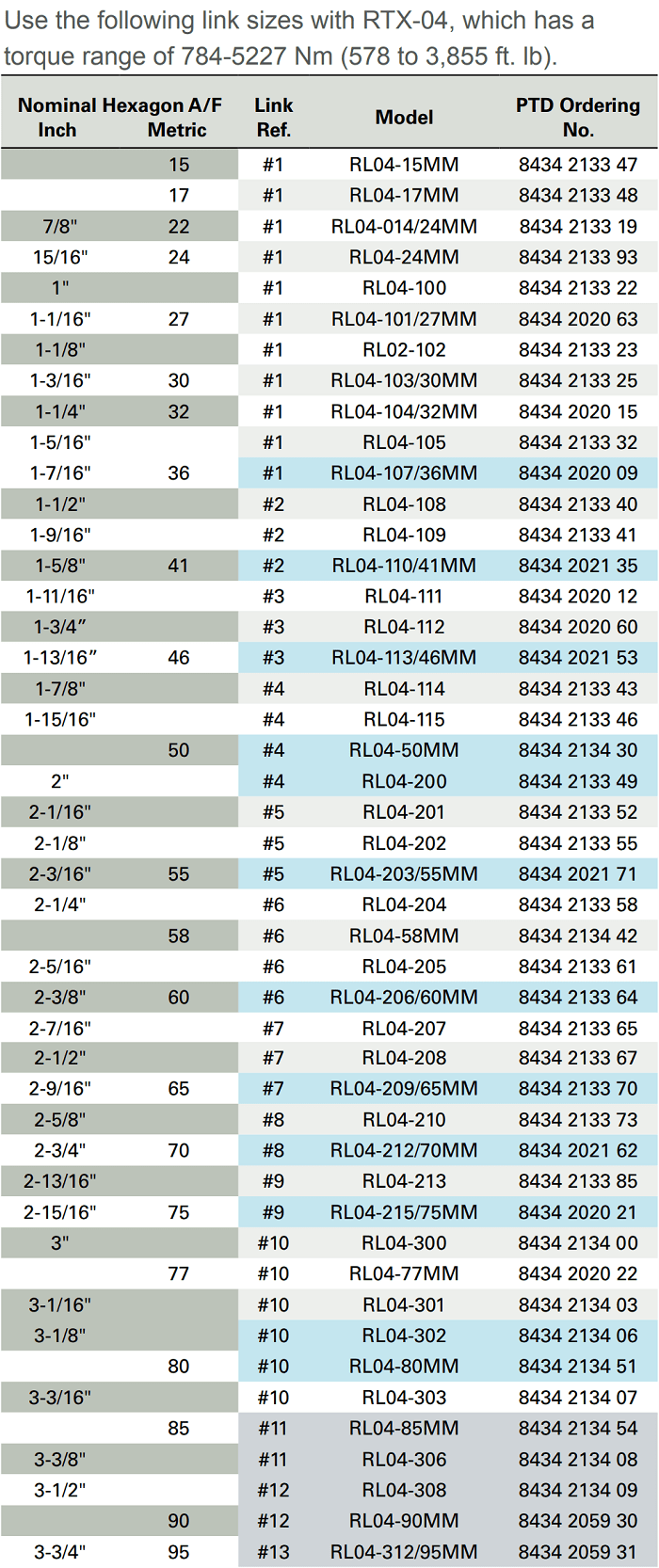 - Để phù hợp với các size bulong trong dải cần siết thông thường người ta chọn 1 xylanh cờ lê thủy lực Atlas Copco RTX-04 (cylinder) phối cho nhiều size tròng cờ lê thủy lực (ratchet link), kết hợp với lót (reducer) để đạt hiệu quả kinh tế tốt hơn. Để tư vấn, chọn lựa tối ưu, hãy liên hệ với chúng tôi.