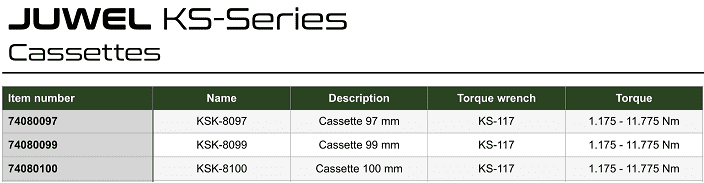 - Cờ lê thủy lực Juwel KS-117, Juwel low hydraulic torque wrench KS-117: là loại cờ lê thủy lực đầu tròng, chuyên dùng để siết lực chính xác các loại bulong lục giác: 100 - 105 mm, với dải siết lực: 1.175 - 11.775 N.m, trong công nghiệp. Cờ lê thủy lực Juwel KS-117 hoạt động ở áp < 700 bar, sai số chế tạo: +/- 3%.