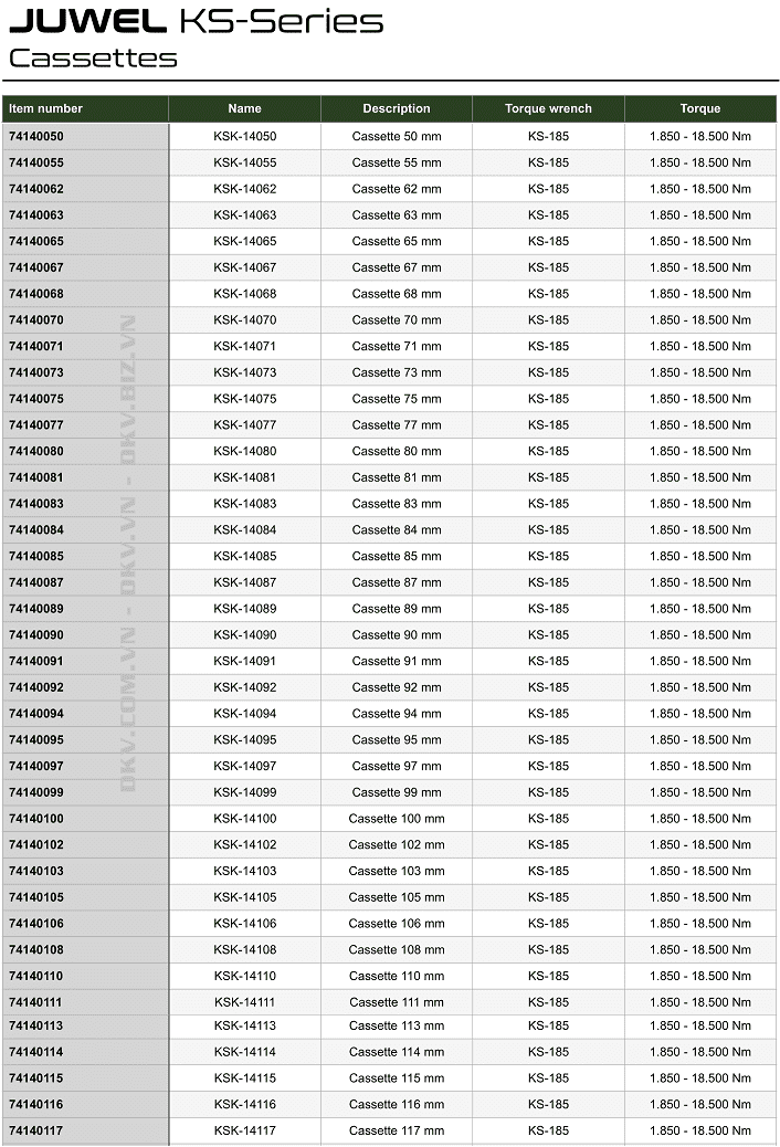 - Cờ lê thủy lực Juwel KS-185, Juwel low hydraulic torque wrench KS-185: là loại cờ lê thủy lực đầu tròng, chuyên dùng để siết lực chính xác các loại bulong lục giác: 50 - 117 mm, với dải siết lực: 1.850 - 18.500 N.m, trong công nghiệp. Cờ lê thủy lực Juwel KS-185 hoạt động ở áp < 700 bar, sai số chế tạo: +/- 3%.