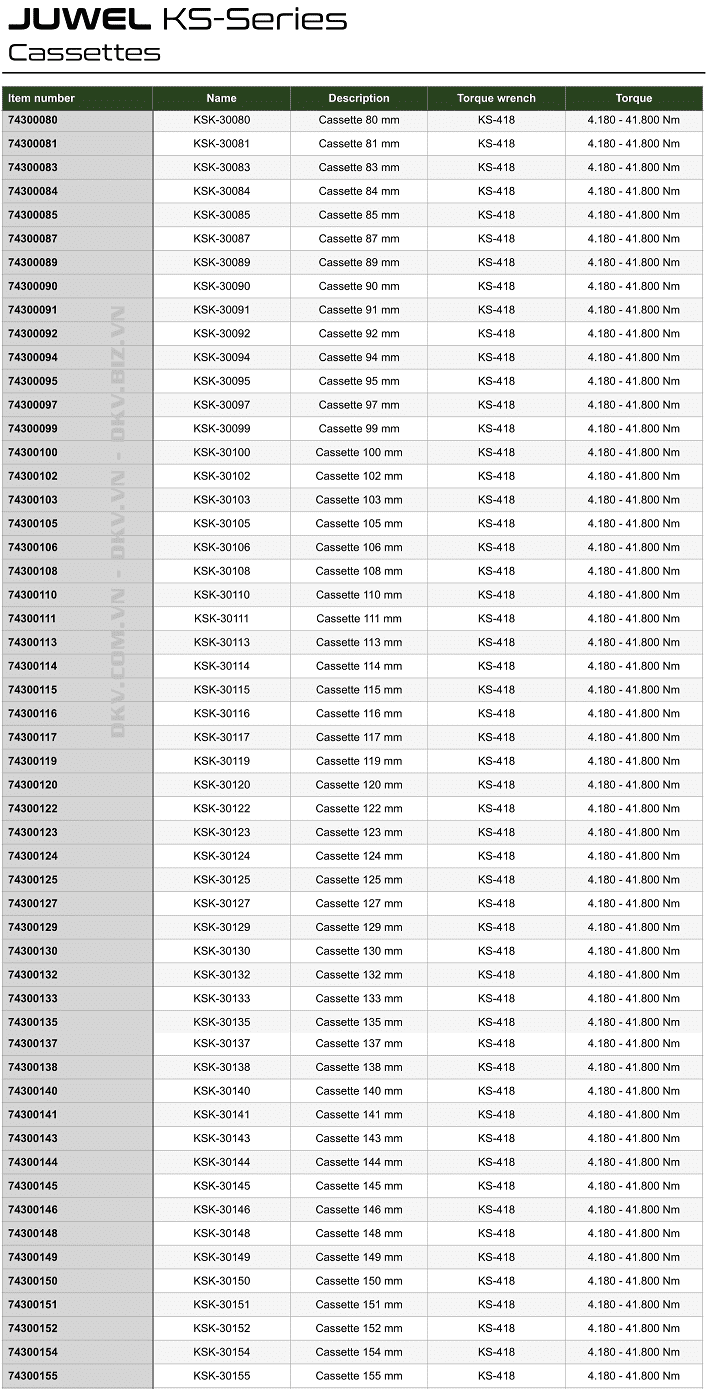 - Cờ lê thủy lực Juwel KS-418, Juwel low hydraulic torque wrench KS-418: là loại cờ lê thủy lực đầu tròng, chuyên dùng để siết lực chính xác các loại bulong lục giác: 85 - 155 mm, với dải siết lực: 4.180 - 41.800 N.m, trong công nghiệp. Cờ lê thủy lực Juwel KS-418 hoạt động ở áp < 700 bar, sai số chế tạo: +/- 3%.