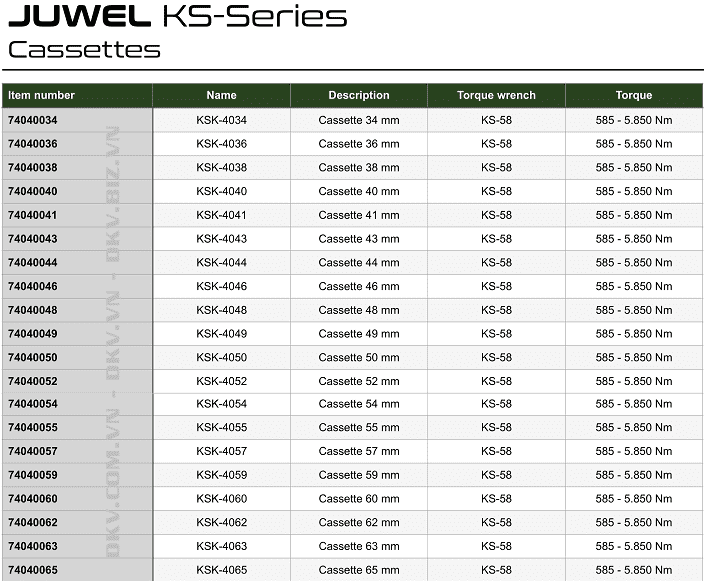 - Cờ lê thủy lực Juwel KS-58, Juwel low hydraulic torque wrench KS-58: là loại cờ lê thủy lực đầu tròng, chuyên dùng để siết lực chính xác các loại bulong lục giác: 34 - 65 mm, với dải siết lực: 585 - 5.850 N.m, trong công nghiệp. Cờ lê thủy lực Juwel KS-58 hoạt động ở áp < 700 bar, sai số chế tạo: +/- 3%.