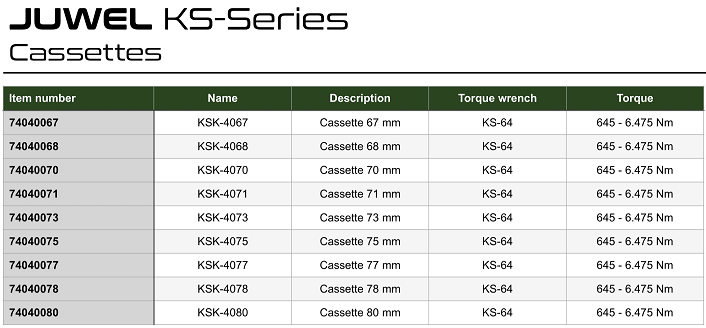 - Cờ lê thủy lực Juwel KS-64, Juwel low hydraulic torque wrench KS-64: là loại cờ lê thủy lực đầu tròng, chuyên dùng để siết lực chính xác các loại bulong lục giác: 70 - 80 mm, với dải siết lực: 645 - 6.475 N.m, trong công nghiệp. Cờ lê thủy lực Juwel KS-64 hoạt động ở áp < 700 bar, sai số chế tạo: +/- 3%.