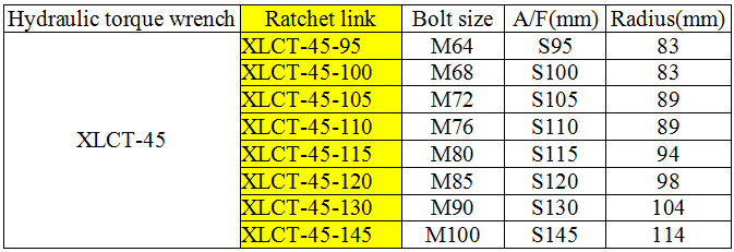 - Để phù hợp với các size bulong trong dải cần siết thông thường người ta chọn 1 xylanh cờ lê thủy lực XLCT-45 (cylinder) phối cho nhiều size tròng cờ lê thủy lực (ratchet link), kết hợp với lót (reducer) để đạt hiệu quả kinh tế tốt hơn. Để tư vấn, chọn lựa tối ưu, hãy liên hệ với chúng tôi.