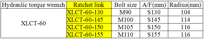 - Cờ lê thủy lực XLCT-60, hydraulic torque wrench XLCT-60: là loại cờ lê thủy lực đầu tròng, chuyên dùng để siết lực chính xác các loại bulong lục giác: 130 - 155 mm, với siết lực 6.285 - 62.851 N.m, trong công nghiệp. Cờ lê thủy lực XLCT-60 hoạt động ở áp < 700 bar (10.000 psi).
